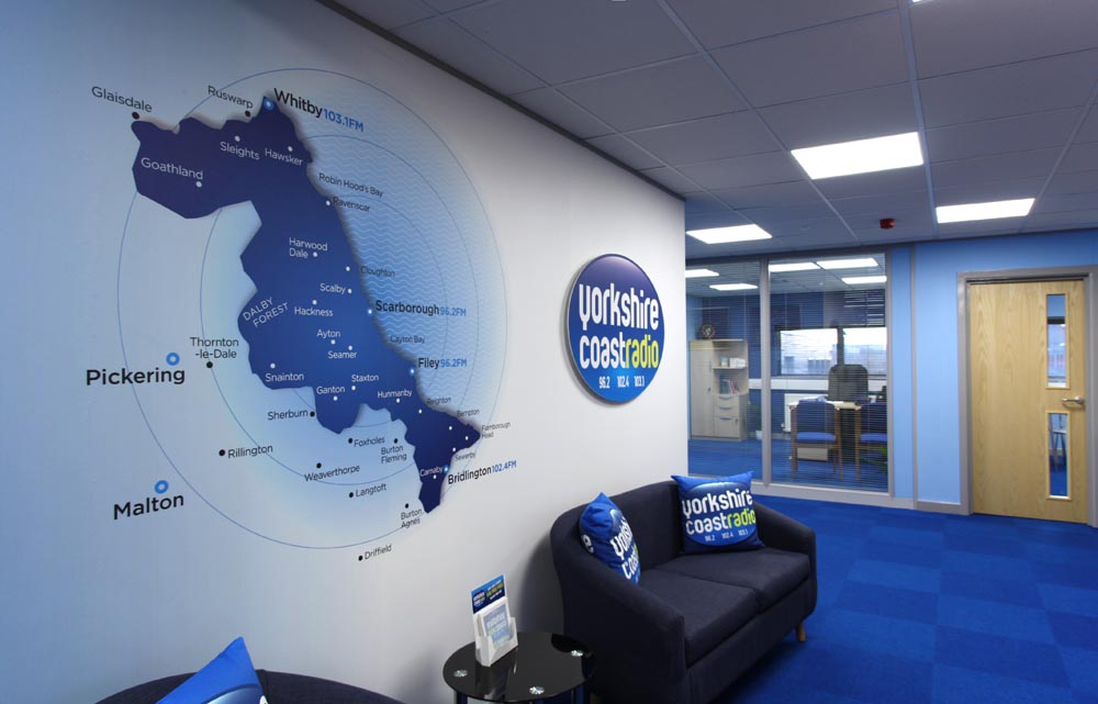 We were approached by Yorkshire Coast Radio to completely revamp the wall space in their reception area, offices & boardroom – They had their design team create the graphics to run inline with their corporate identity and we did the rest! The result is a wonderful, welcoming “brand led” reception / meeting areas, and a fun – light hearted office space.